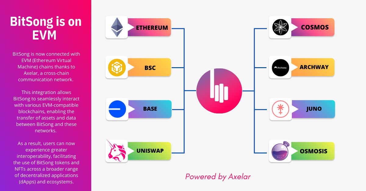 EVM chains are a core component of the decentralized finance (DeFi) landscape, hosting numerous applications and platforms that cater to a global audience. By leveraging Axelar's cross-chain communication capabilities, BitSong can now participate in this expansive network, providing our users with enhanced accessibility and functionality.